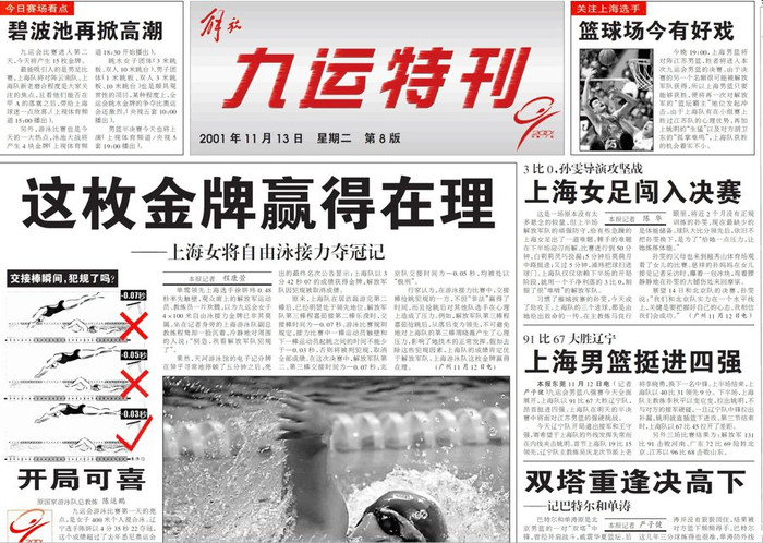 2001年,广东举办九运会,《解放日报》推出的全运特刊报道。