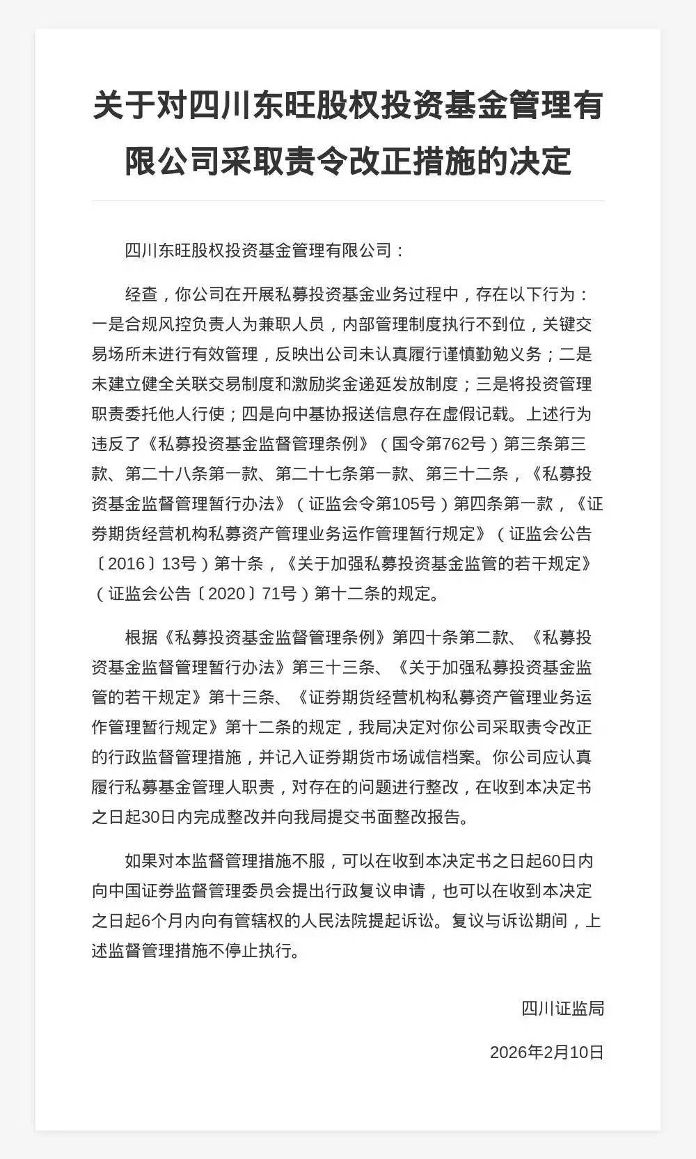 蓝鲸新闻3月10日讯,近日,四川证监局发布行政监管措施决定书,剑指四川东旺股权投资基金管理有限公司。