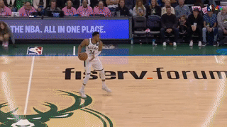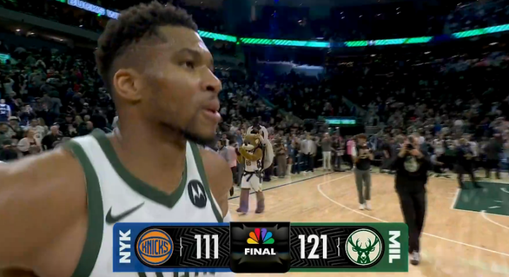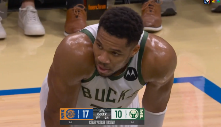期间字母哥离谱走步一幕引热议——第一节5分20多秒,雄鹿打出反击,字母哥接球后只运了一次球,便持球走到禁区扛着唐斯把球打进;慢镜头显示,这一球字母哥足足走了5步,他当着边裁和底线裁判的面抱球走步,裁判居然没有吹罚走步。